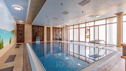 1-й уровень: бассейн с противотоком, гейзером и водопадом, душевая, сауна, санузел, тренажеры/