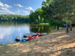 Дорога до поселка асфальтированная, в поселке - из срезки асфальта. Охраняемая закрытая территория. 700 м до пляжа на берегу Истринского водохранилища, где есть беседки для отдыха, прокат лодок и гидроциклов, центр водных видов спорта