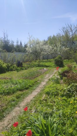 Фруктовый сад- 3 яблони, 2 груши, 3 вишни, 3 сливы, виноград, жимолость, черешня, кусты смородины и малины