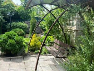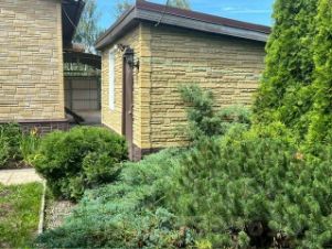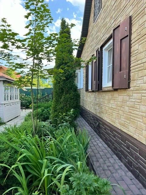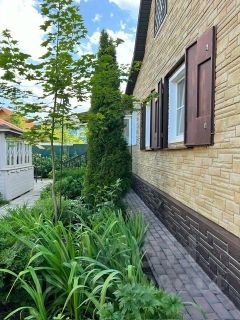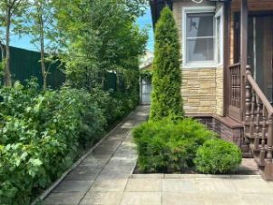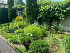 Участок ровный, огорожен забором из профнастила. Перемещаться можно по дорожкам, уложенным плиткой с дренажной системой. На участке применён ландшафтный дизайн: высажено множество взрослых растений, которые в летнее время создают приятную тень и прохладу, многолетние кустарники, цветы и стелящиеся хвойные украшают собой альпийские горки. Вдоль дорожек высажены плодовые растения, которые летом будут радовать своим урожаем, а по забору пущены лозы чёрного винограда.