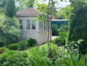 На участке так же предусмотрены: объёмная бытовка для складирования садовой утвари, двухместная крытая парковка, выложенная брусчаткой, колодец, закрытая беседка, в которой можно собираться с друзьями или просто ужинать. Пространство перед входом уложено плиткой, что позволяет поставить туда бассейн или мангал, порадовав себя блюдами на гриле.