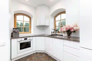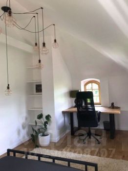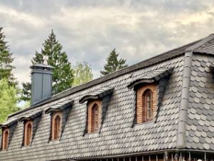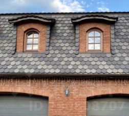 Крыша выполнена из двухцветной немецкой натуральной черепицы. Окна и пол из дуба.