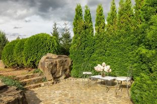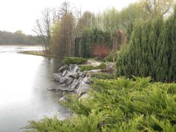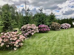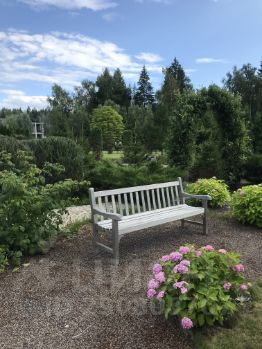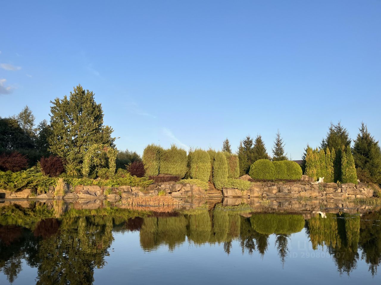 На участке выполнен уникальный ландшафтный дизайн в природно-регулярном стиле с обустройством собственной береговой линии каменными валунами и подпорными стенками, посажено более 700 растений.