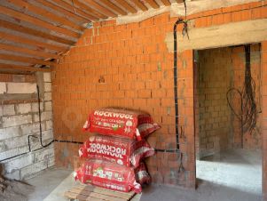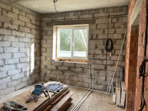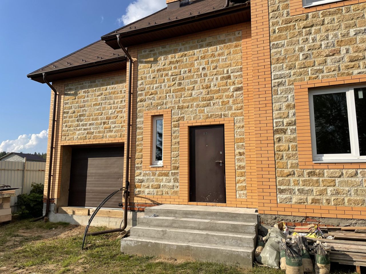 Наружные стены Дома состоят из пеноблока, за ним кирпич, далее облицован натуральным камнем, углы дома и вокруг окон облицовочный кирпич. Перегородки внутри дома кирпичные.