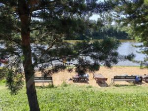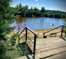 Песчаный вход в воду, лавочки для отдыха, мостики для прогулок вдоль воды.