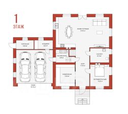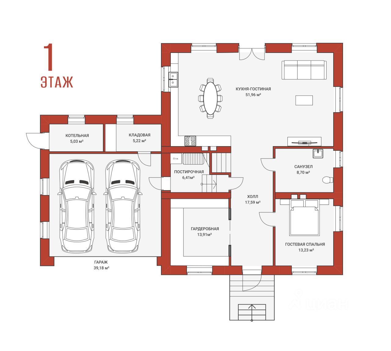 1 этаж: холл, гардеробная, с/у, постирочная, гостевая спальня или кабинет, кухня-гостиная, гараж на 2 машиноместа, котельная, кладовая.