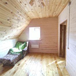 Дом построен из пеноблоков, фундамент- монолитная плита, кровля ондулин.Утеплен, внутренняя отделка доска имитация бруса.
