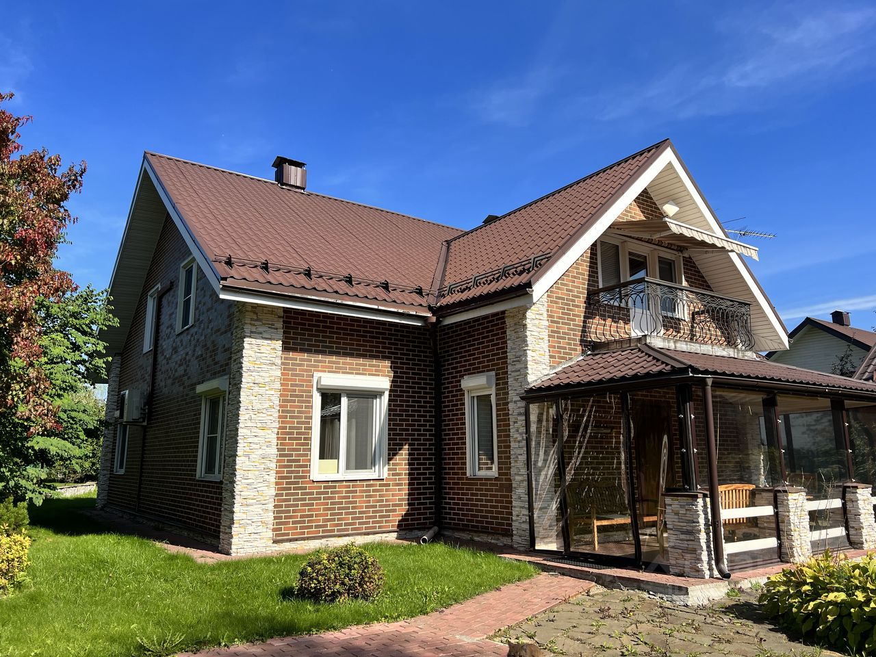 Фундамент - бетонная подушка, стены из пеноблоков, отделка дома фасадными термопанелями с немецкой клинкерной плиткой, крыша - металлочерепица.