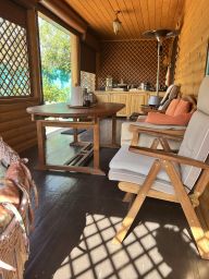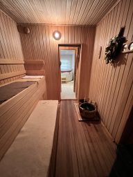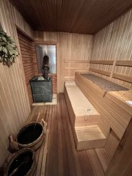Для круглогодичного проживания в камерном поселке "Турово-плюс", на земельном участке 14,6 соток. Баня русская с джакузи, комнатой отдыха, 2 этажа 120 кв.м. Баня и дом с кондиционерами. За баней - дровница.