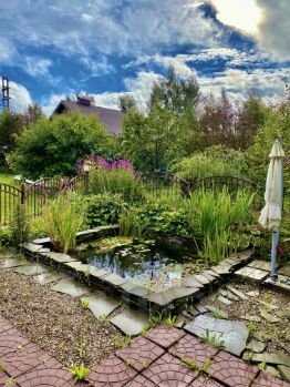 Участок ровный, правильной формы, есть небольшой пруд, ландшафтный дизайн, высажены цветы, плодовые деревья и кустарники, зона барбекю. Проведен дренаж.