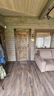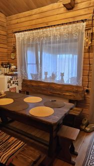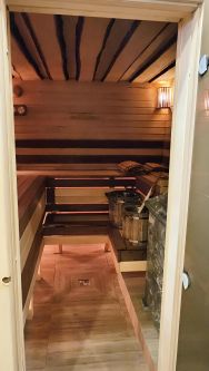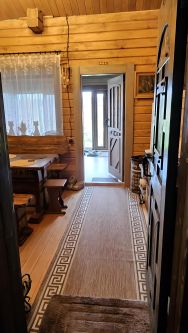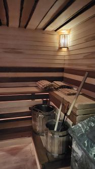 Планировка бани: большая терраса со спальным местом и кофейным столиком с креслами, отдельная дверь в банную часть (уютная комната отдыха с мебелью под старину, холодильник,телевизор,караоке), душевая, парная. В парной печь Гефест с облицовкой из змеевика (одна из лучших дровяных печей). Такого пара вы точно нигде не встречали!