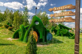 прогулочные зоны, русская баня, турецкий хаммам, финская парная, детский развлекательный центр, контактный зоопарк в окружении воды, ресторан и два банкетных зала (на 60 и 120 гостей), крупнейший в России Парк динозавров.
