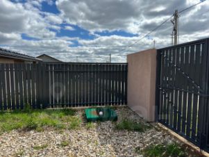 По периметру участка каменный забор с ленточным фундаментом с ростверком. Отделка: штукатурка, короед и декоративная подсветка. Распашные ворота, калитка с замком.