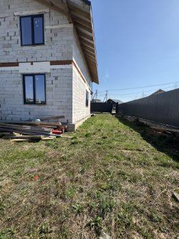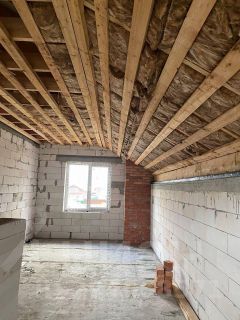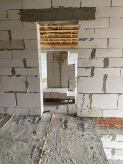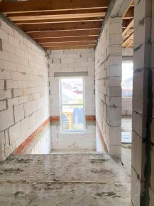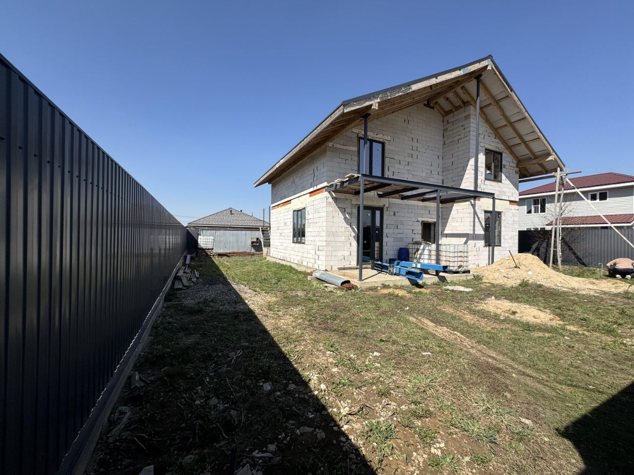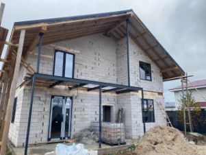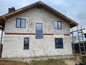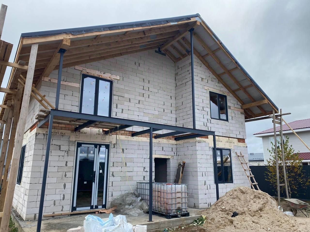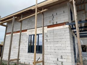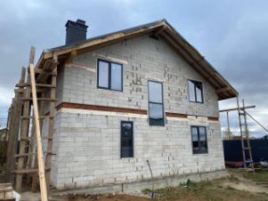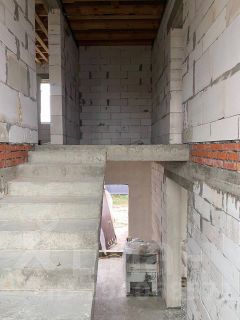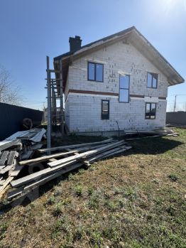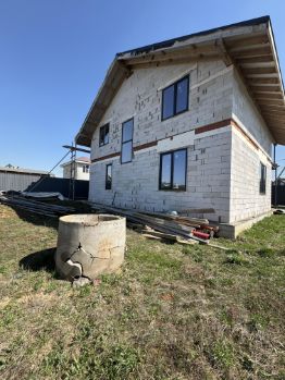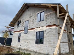 Свайно-ростверковый фундамент с монолитной плитой на песчаной подушке под всей площадью дома (Бетон М 350). Стены пеноблок- бонолит, внешние 300 мм, внутренние капитальные перегородки 250 мм. Межэтажные перекрытия - железобетонные плиты, монолитная лестница, 2 армопояса. Перемычки Дверных и оконных проемов монолитные. Крыша - мягкая кровля, утепление 200 мм. Смонтированы и установлены дымоход и вытяжка из котельной (выполнена из кирпича).В доме установлены ламинированные энергосберегающие окна Rehau. Выполнены штукатурка 1 этажа. Частично 2 го этажа.