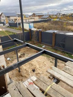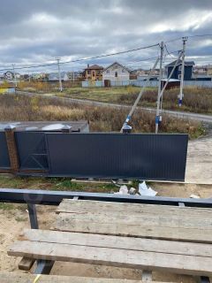 Периметр участка огорожен забором из профнастила с откатными автоматическими воротами, забор построен на монолитном фундаменте. Въездная группа также выполнена из монолита. Столбы лицевой части забора выложены из чистового кирпича. Профнастил на лицевой части забора установлен с двух сторон.