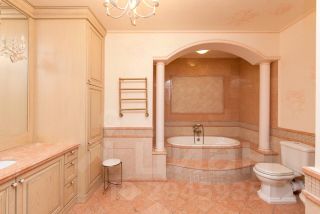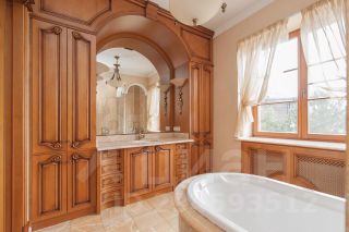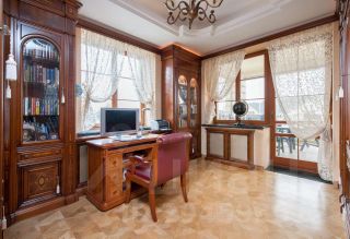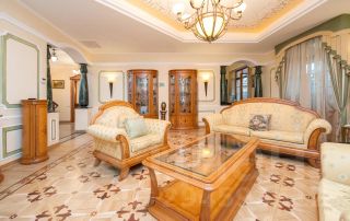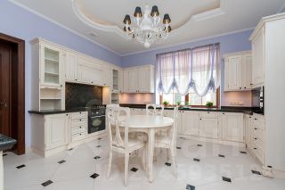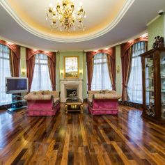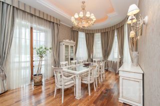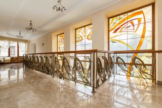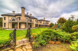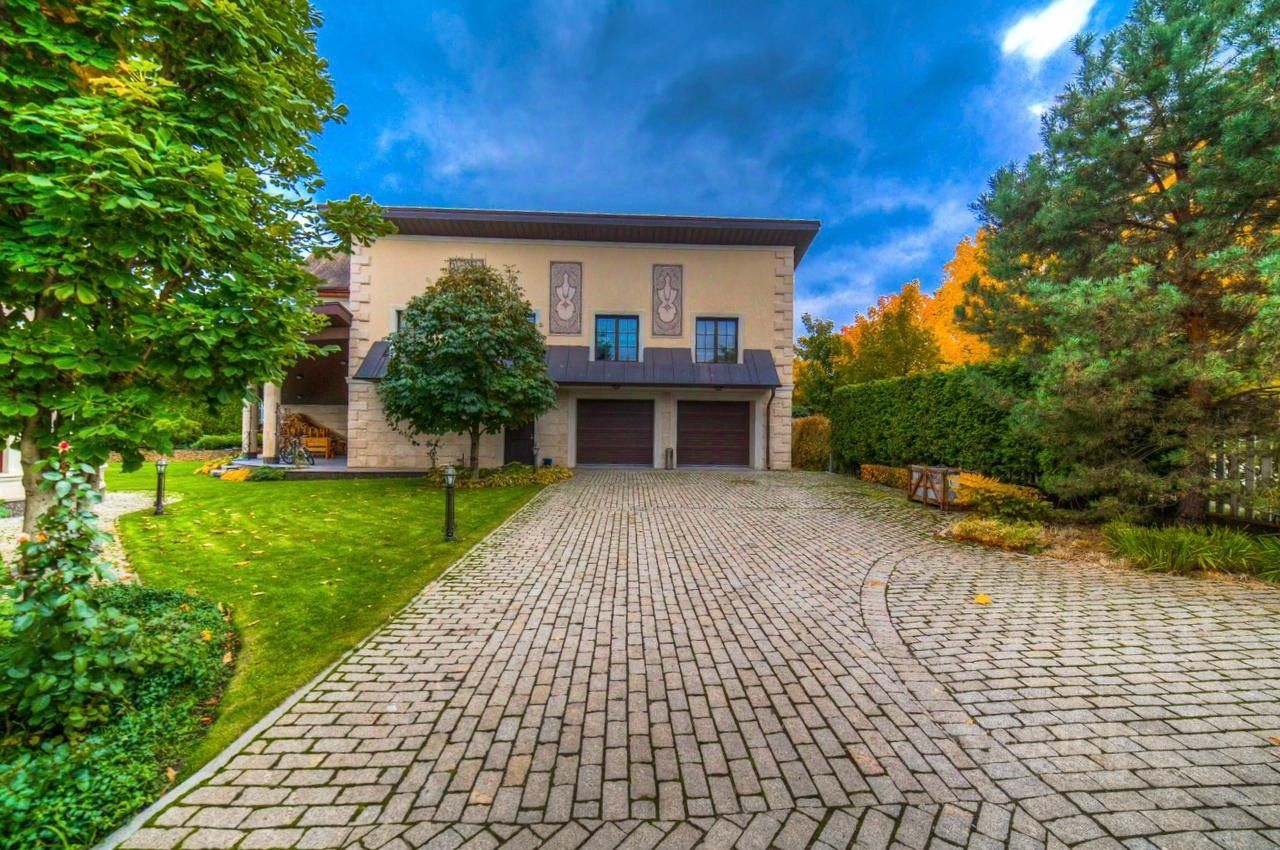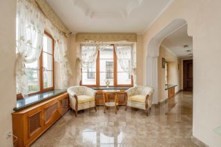 Дом в классическом стиле с продуманной планировкой. При строительстве и отделке использовались высококачественные материалы. Фасад отделан натуральным камнем, а кровельное покрытие из меди с функцией подогрева. Во внутренней отделке был использован мрамор, дуб, бронза, оникс, выполненные вручную мозаичные панно, наборный паркет, кованые ограждения и люстры, витражи, изготовленные по индивидуальному заказу. Дом оснащен системой видеонаблюдения. Есть лифт.