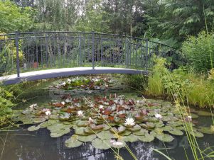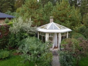 На участке выполнен ландшафтный дизайн с живописным прудом, а также расположена теплая беседка с каменной печью и встроенным мангалом.