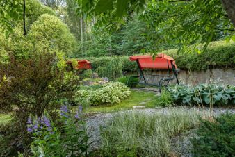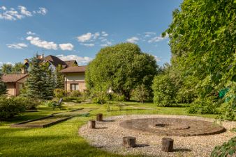 На участке построен отдельно стоящий гараж на два автомобиля, беседки для отдыха. Все постройки выполнены в едином стиле и одинаковой цветовой гамме.