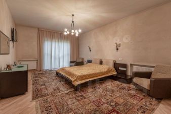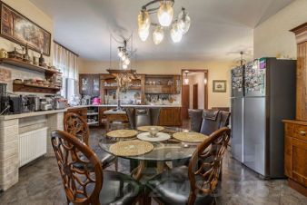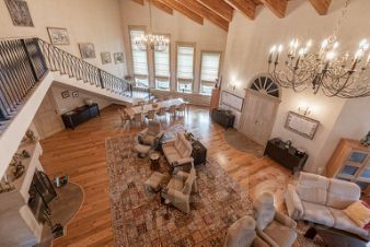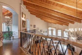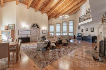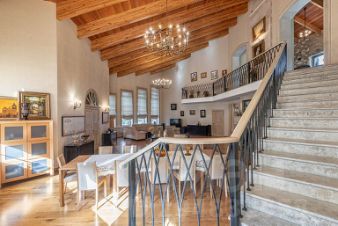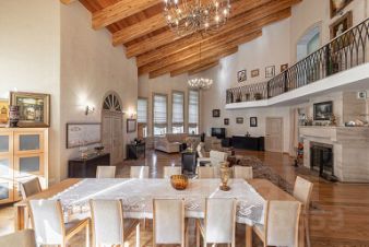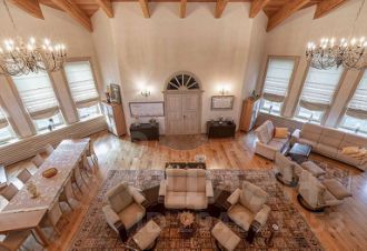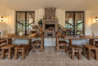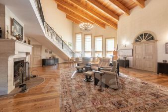 В доме 10 спален, гостиная с камином и вторым светом, 6 санузлов и хамам, крытый бассейн и бильярдная.Интерьер дома полностью соответствует стилю. Сочетание массивных потолочных деревянных конструкций и натуральных отделочных материалов, стулья и кресла с некоторой угловатостью линий все элементы работают на создание неповторимой атмосферы особняка. Светильники настенные и подвесные стилизованы под подсвечники. Немного мягче оформлены спальни, но и здесь прослеживается сдержанность и лаконизм.