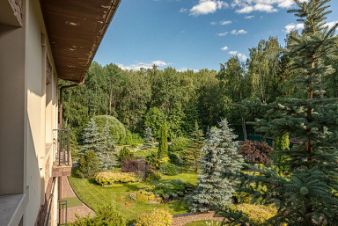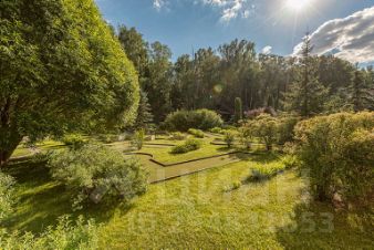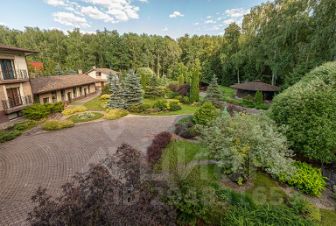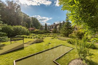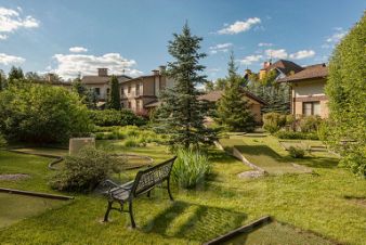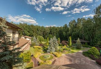 На участке выполнены ландшафтные работы. С двух сторон к нему примыкает лесной массив, а напротив лиственных деревьев вдоль границы частной территории высажены голубые ели. На участке много декоративных кустарников, но почти нет цветов. Зато есть поле для мини-гольфа. Дорожки на участке выложены тротуарной плиткой, вдоль них установлены фонари в виде шаров на невысокой ножке.