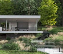 Воздушный, слегка сдержанный и "чистый" экстерьер смотрит на ручей, с другой стороны которого всю композицию уравновешивает летняя терраса-патио. Под ногами зелёный ковер, который лаконично декларируют аскетичный северные "многолетники".