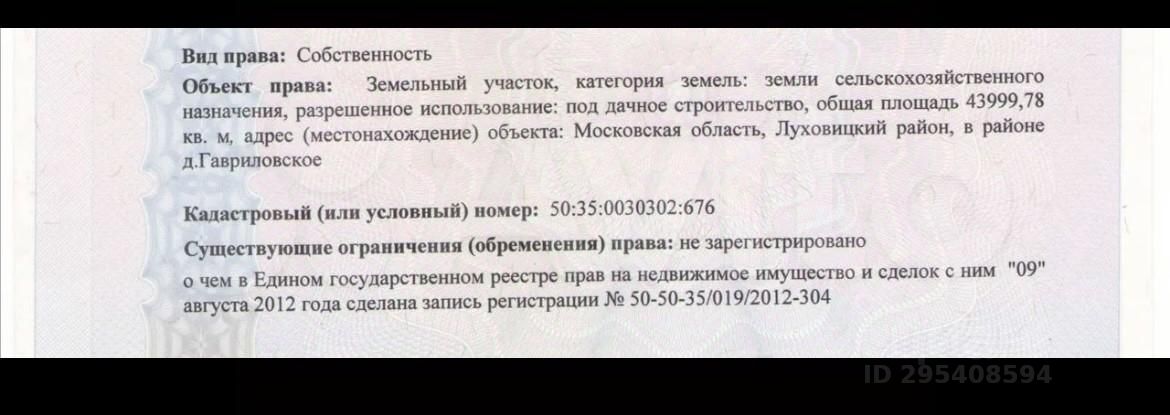 Земельный участок, категория земель: земли сельскохозяйственного назначения, разрешенное использование: под дачное строительство, общей площадью 43999,78 кв.м., находящийся по адресу: Московская область, Луховицкий район, в районе д. Гавриловское. Кадастровый номер 50:35:0030302:676. Без ограничений (обременений)