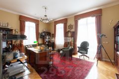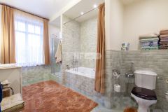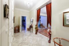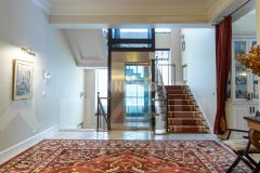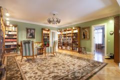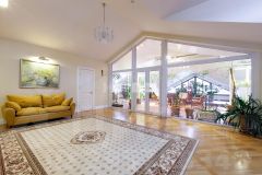 Дом построен по индивидуальному проекту в стиле неоклассицизм и оборудован всем необходимым для комфортной жизни: 6 просторных спален, каждая с гардеробной комнатой, 7 санузлов, финская и турецкая бани, домашний кинотеатр, винный и продуктовый погреба, спортивный зал, оранжерея. В доме 4 полноценных этажа, на каждом из которых есть остановка панорамного лифта грузоподъёмностью до 380 кг.