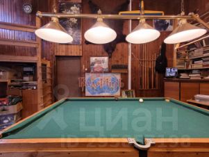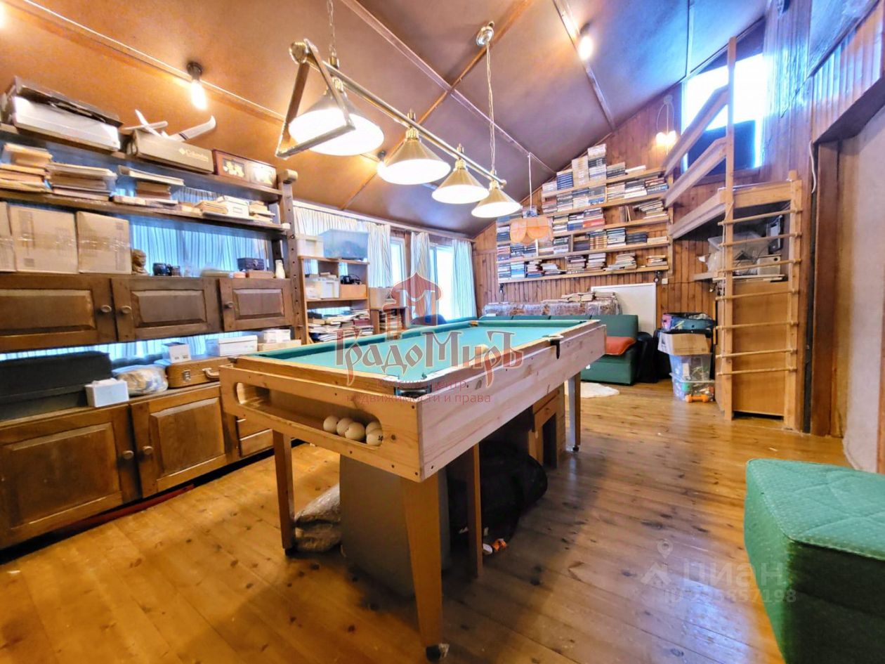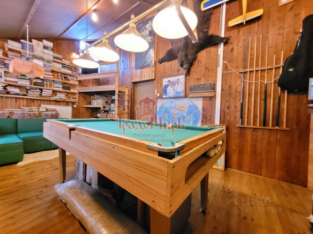 Планировка первого этажа: просторная и светлая веранда 31 кв. м, кухня-гостиная с печью-камином 34.3 кв. м, баня с дровяной печью, совмещённый СУ, бильярдная комната она же и библиотека 25 кв. м