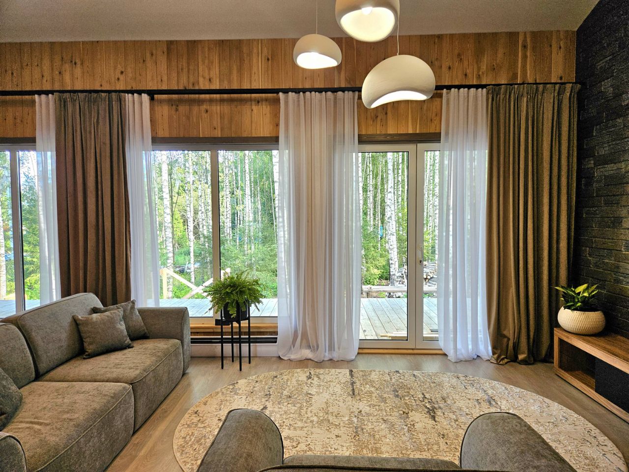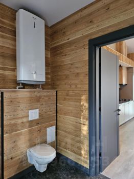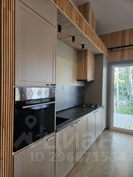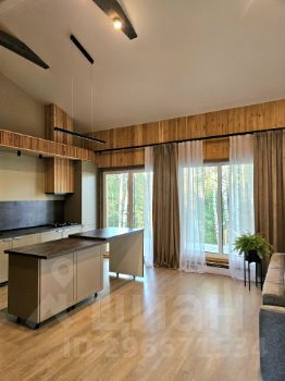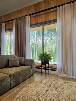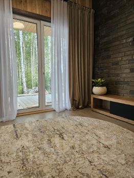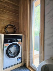 - Просторная кухня- гостиная с витражными окнами, выходом на веранду и прекрасным видом на лесной участок. Высокие потолки (5,3 м) -Сан узел