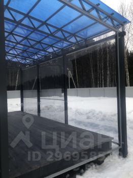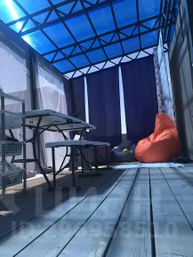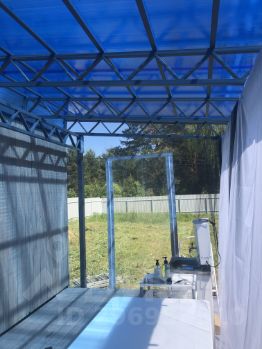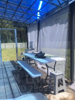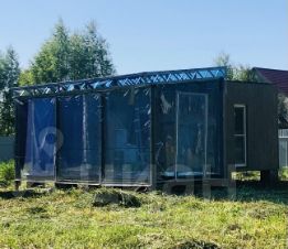 Первый домик: с навесом и с террасой, терраса полностью закрыта мягкими окнами. Электричество заведено в домик.