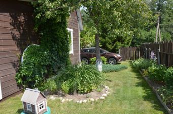 Участок огорожен деревянным современным штакетником и металлопрофилем. Два въезда выложенные тротуарной плиткой. Построен гараж на монолитной плите 7 х 4,5 м., уютный современный вигвам с очагом для приятных посиделок у костра, теплица, сарай с навесом для дров и отдельный навес для барбекю. Зона отдыха выложена плиточкой. Посажены фруктовые деревья, плодовые и декоративные кустарники. Вся территория очень ухожена, засеян газон, сделан декоративный прудик. Участок расположен рядом с лесом, есть собственный вход и зимой собственный въезд для снегохода.