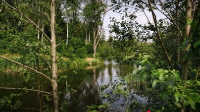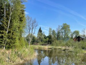 участок на склоне холма с видом на пруд, с вековыми деревьями, соседние дома уже заселены, в камерном КП "Радость". Хвойный реликтовый лес, холмистый ландшафт, небольшое озеро на территории поселка. На участке, помимо елей, сосен и лип, растет, по всей вероятности, самый старый и самый большой береза в регионе.