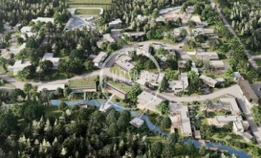 Фасадная часть строения смотрит в долину ручья, на зелёные кровли, как бы распахивая ощущение объема из окон. Взрослые деревья гармонично обрамляют внутренний двор и патио, создавая особую эстетику тектонических структур на фоне сказочного леса.