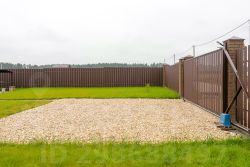 Территория участка огорожена забором 220 см из евроштакетника, фасадная часть на фундаменте. Откатные ворота с пультом.