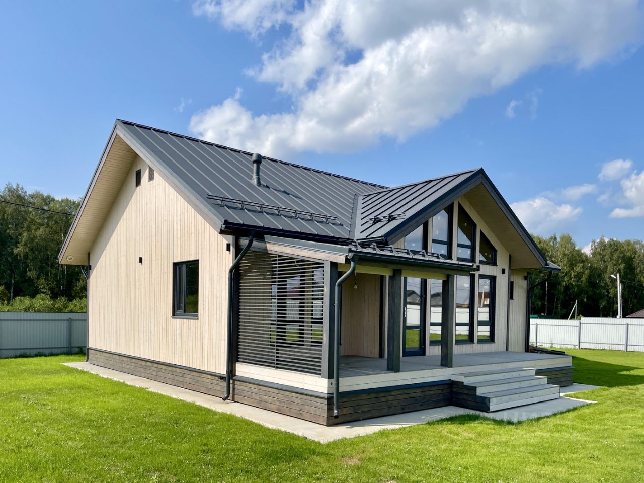 Участок полностью выровнен (засеян спортивным газоном Мираторг), забор из профнастила, откатные ворота с пультом ДУ. Бетонная отмостка, залита парковка на 2 машины.