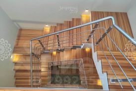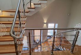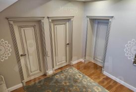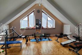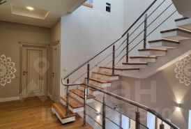 В основном доме 3 уровня. На первом: прихожая, гардеробная, гостиная, которая отделена от кухни-столовой очень красивым порталом, котельная с выходом на участок, санузел с инсталляцией. Изюминка дома - очень красивая лестница с подсветкой, которая выполнена из бетона, и есть такое впечатление, что торцы ступеней как будто висят в воздухе. Поднимаемся на второй этаж, здесь: 4 спальни (в главной окна в пол и французский балкон), душевая с компактной сауной (прогревается за 30 минут) и санузел с ванной. На третьем мансардном этаже свободное пространство без перегородок, которое лаконично зонировано на спортивную зону, TV зону, кабинет и ниши для хранения.