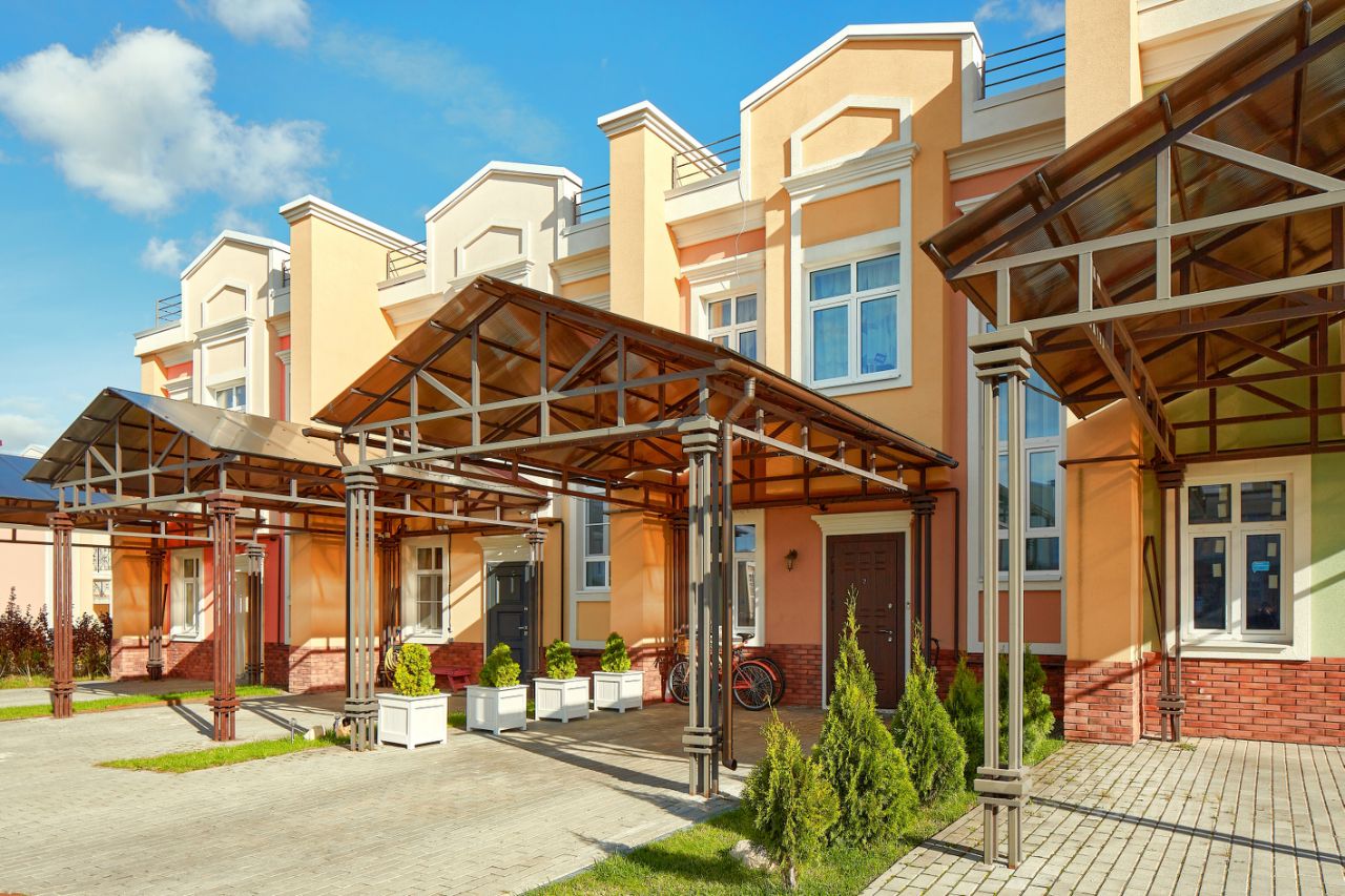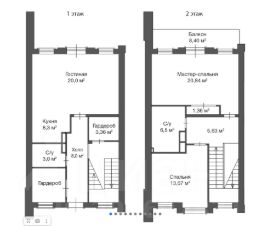 Планировка: на 1-й этаже - прихожая, санузел-постирочная, гардеробная, кухня- гостиная, выход на собственный участок; на 2-ом этаже - 2 спальни, одна из них с выходом на большой балкон, выход на эксплуатируемую крышу, где можно обустроить зону отдыха. Потолки 3 метра. 2 камерные стеклопакеты, 2 машиноместа перед таунхаусом, навес для автомобиля.