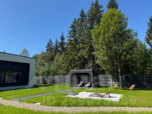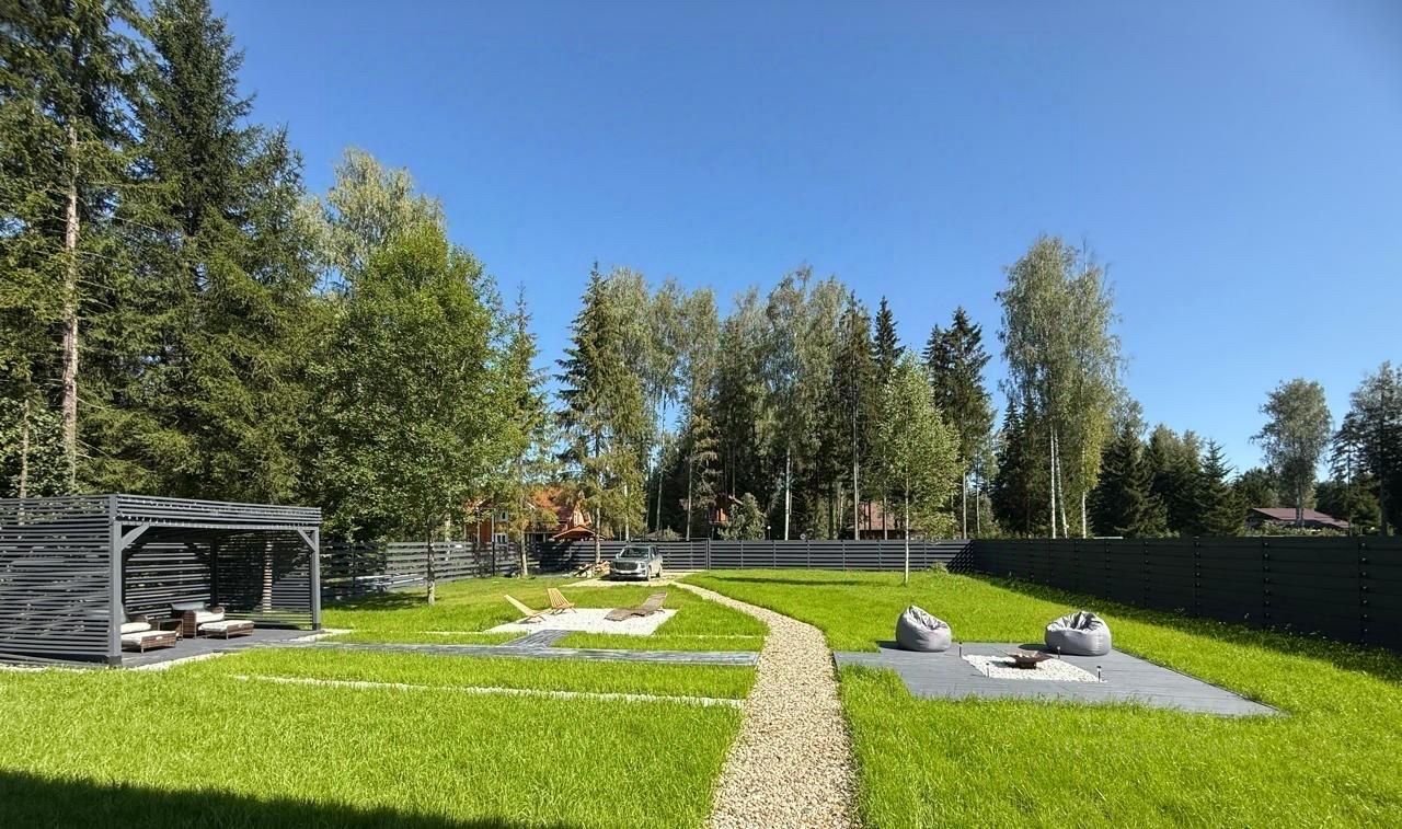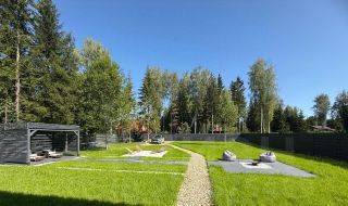 Вокруг дома сделана отмостка из щебня. Также из щебня выполнена парковка (10 х 5) и дорожка. Засеян газон.