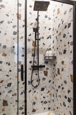Санузел оборудован стиральной машинкой weissgauf на 9кг, полотенцесушитель, стеклянная душевая Passage PA, душевая стойка Gappo, обливочное устройство EVEREST 15л, стеллаж, тумба с раковиной ika lite, смеситель черный, унитаз ceruttispa, зеркало BelBagno.