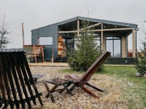 В доме две изолированные комнаты с панорамными окнами, одна во двор, другая в поле, в каждой комнате стоит кондиционер, кровать 160х200, матрас, конвектор и тумбочки.