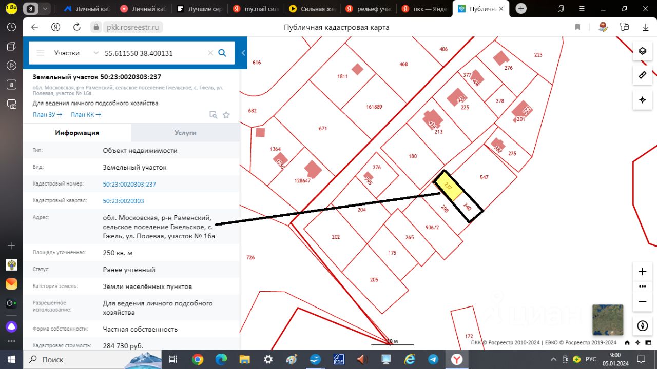 Участок 5 соток - состоит из 2 участков по 2,5 соток, категория земель земли населенных пунктов, виды разрешенного использования для ведения личного подсобного хозяйства, адрес: 140165, обл. Московская, р-н Раменский, сельское поселение Гжельское, с. Гжель, ул. Полевая, участок 16 и 16а, размер двух - 12,5 метров на 40 метров, перепад высот примерно 3 м (по карте смотрел). Кадастровые номера 50:23:0020303:237 и 50:23:0020303:240. Координаты - 55.611559 38.400125. Подъезд нормальный - дорогу чистят зимой. До жд.станции 55 км 1,2 км 14 мин., до авт.остановки и магазинов 500 м 6 мин. Пешком. Рядом церковь (500 м). Школа 1 км. Строить дом можно не шире 6 метров из-за ширины участка. Газ, электричество по границе.