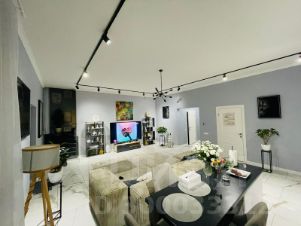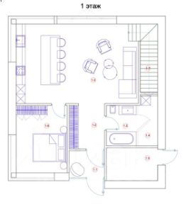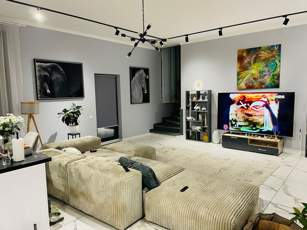 На первом этаже расположены кухня-столовая с выходом на террасу, укомплектованная бытовой техникой HANSA; гостиная с панорамными окнами; гостевая спальня; санузел; котельная; кладовая; прачечная.