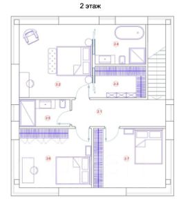 На втором этаже находятся мастер-спальня с санузлом и гардеробной, еще две спальни и санузел.