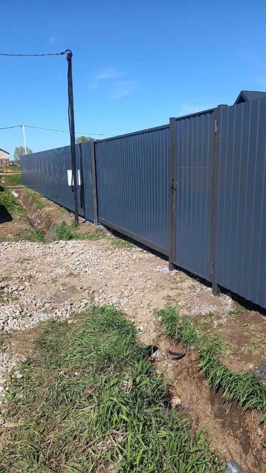По всему периметру участка установлен забор из профнастила 2000мм, с откатными воротами шириной 4 метра и отдельной калиткой.