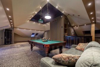 Дом рассчитан на большую семью: в нём четыре спальни, две кухни, столовая, гостиная, 6 санузлов. Есть просторная гардеробная, для главы семьи обустроен кабинет. Часть площади дома отведена под подсобные помещения (их восемь), постирочную и котельную. Вход из дома в гараж отделяет от жилой территории маленький холл. Предусмотрена комната отдыха: она же играет роль бильярдной.