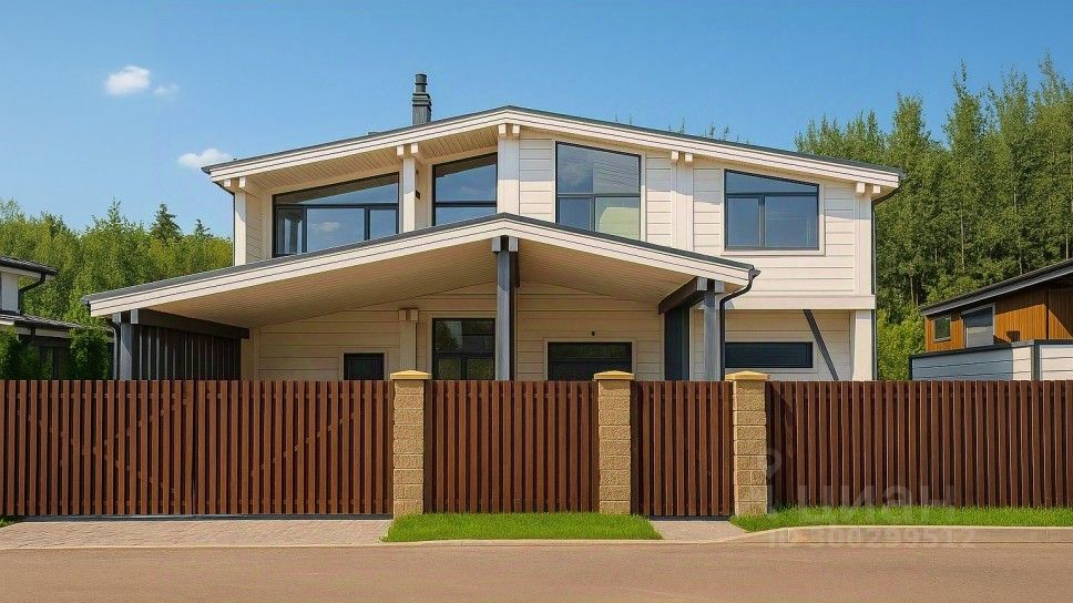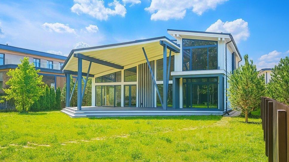 Дом построен по индивидуальному проекту по технологии фахверк с заполнением клееным брусом. Высота полотков в гостиной до 5.5 метров, в остальных помещениях не ниже 3.2.м. Панорамные окна и просторная терраса в видом на лес. Есть полностью готовый дизайн проект внутренней отделки и ландшафтный проект участка. Стены внутри и снаружи окрашены, для электрики в брусе есть скрытые каналы, дом отапливается - отделка займет намного меньше времени, чем в монолитном доме.