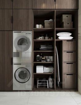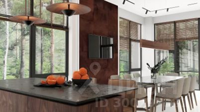 Miele, включена в стоимость типа отделки под ключ. Возможен вариант меблировки дома. Над зоной кухни-гостиной, применено решение второго света с исполнением светового фонаря в области потолочного пространства (высота потолка 6м). Камин. Постирочная и гардеробные помещения