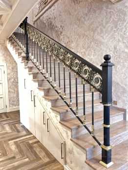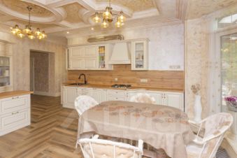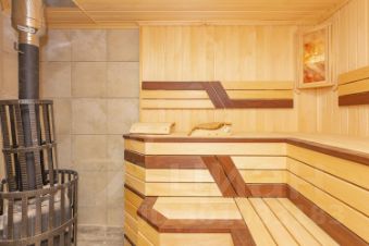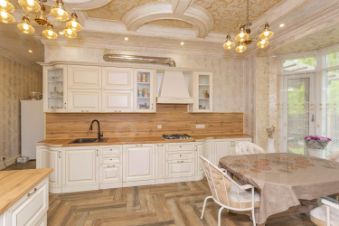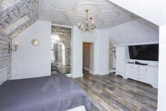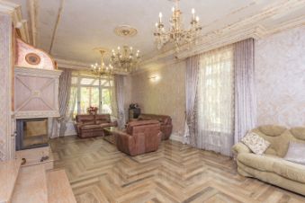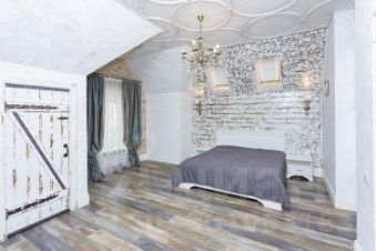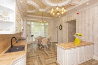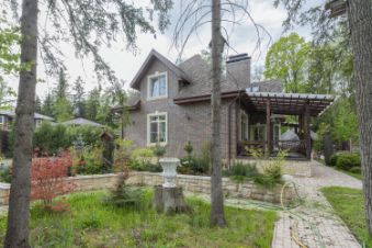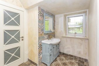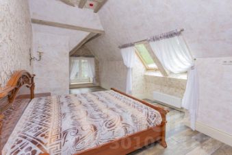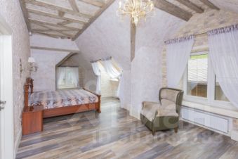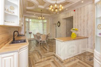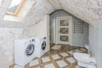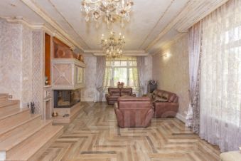 Внутри дома выполнен дизайнерский ремонт, стены и потолки отделаны венецианской штукатуркой. Все помещения меблированы и оснащены необходимой бытовой техникой. В доме на 1-м этаже расположены удобная холл-прихожая с гардеробной, роскошная кухня-столовая, просторная гостиная с камином, уютная гостевая комната с сауной и ванной с туалетом, гостевой санузел, зимний сад, котельная, а также тенистая просторная терраса. На 2-м этаже находятся рабочий кабинет/гостевая комната с туалетом и душем, две изолированные спальни, каждая из них со своим санузлом и душевой кабиной. В большом санузле оборудована прачечная.