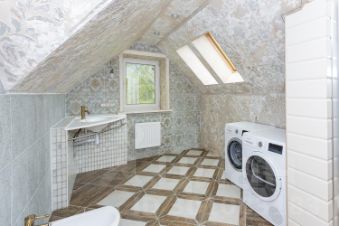 На участок, в дом и в гараж с квартирой заведен магистральный газ (установлены два газовых котла Buderus 45 и 35 кВт), две электрические линии по 15 кВт с напряжением 380 вольт (три фазы). Вода подается из собственной скважины (эл. бойлер 200 л, система теплый пол на 1-ом этаже), канализация - два септика Топас (на 6-8 чел. для дома и на 4-6 чел. для гаража с квартирой). В дом проведен высокоскоростной интернет. Крыша - мягкая черепица.