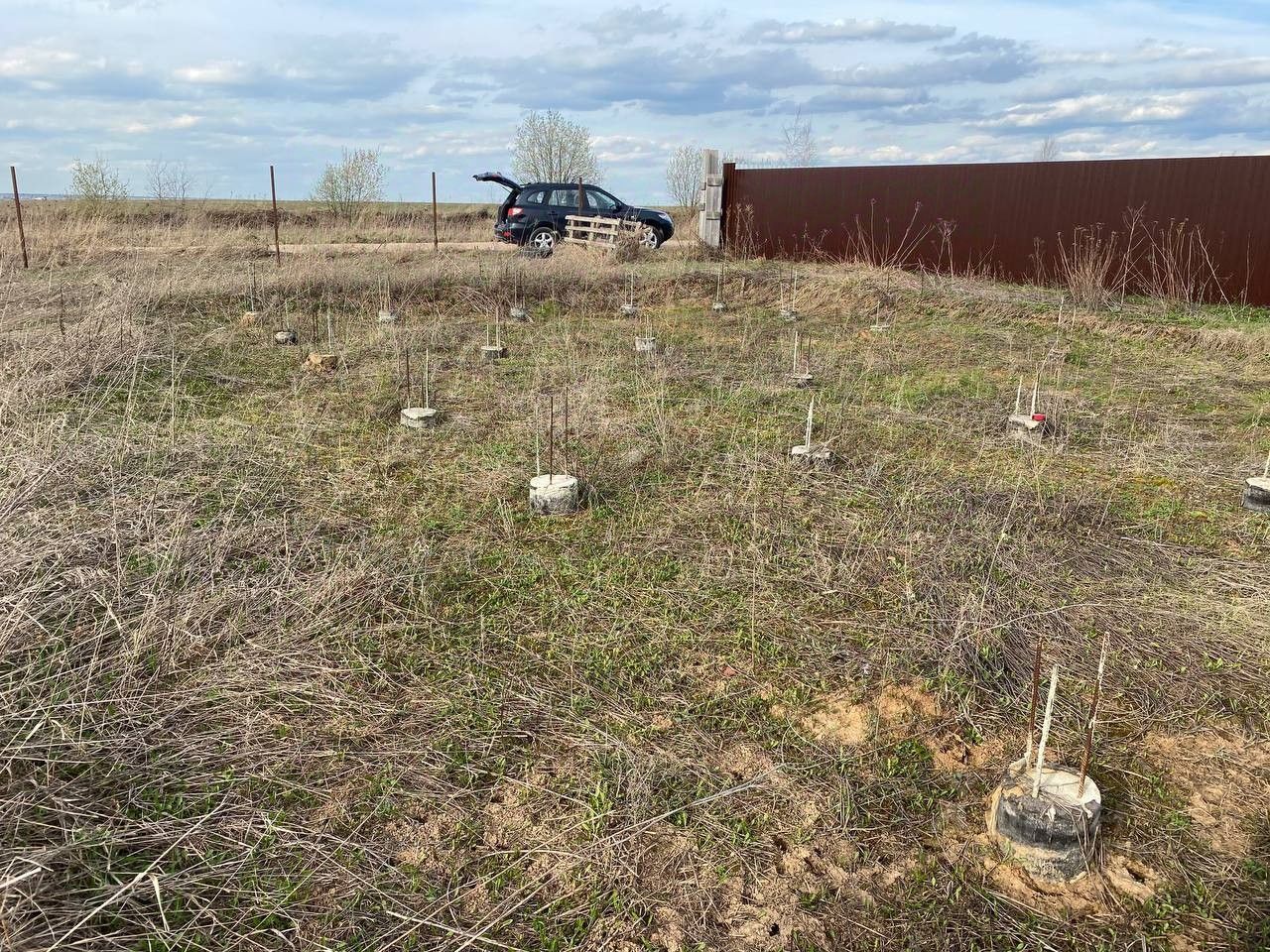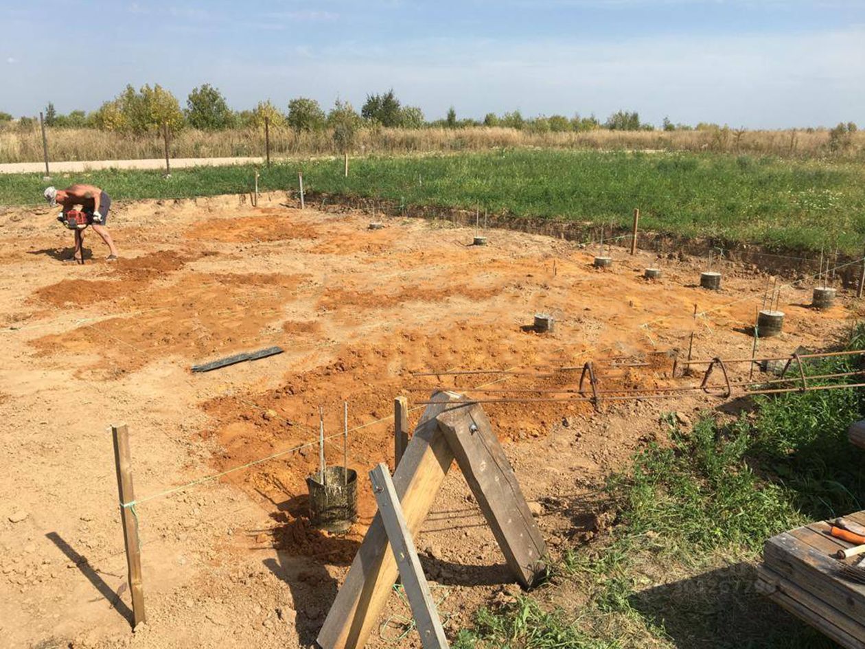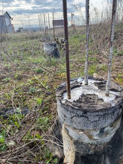 На участке под свойно-ростверковый фундамент дома, залиты железобетонные сваи, глубиной 2.5 метра, размер фундамента- 7.5*12 м. При желании, можно часть свай спилить, а часть добавить, с целью увеличения/уменьшения площади дома.